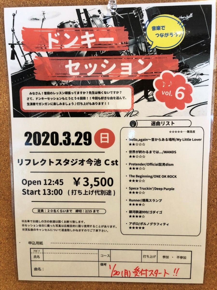 そして3/29に行われるドンキーセッションvol.6の申込みが20日より開始してます。参加ご希望の生徒さんはどしどしご応募ください♪例によってドラム枠は先着順ですのでよろしくお願いします!